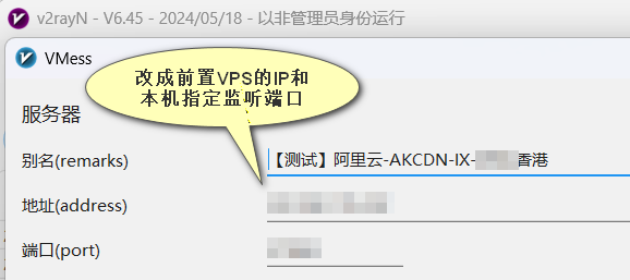 首先在本地魔法客户端中导入你在步骤#1中获得的原始魔法链接,然后编辑此节点,手动修改节点IP和端口为步骤#3中的前置机IP以及端口B。
