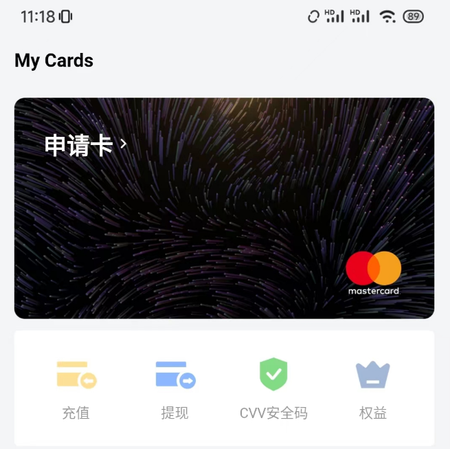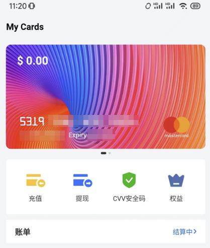 高级卡开卡将直接从你钱包扣除10U 20U(这里指的是USDT),然后你可以得到一张如下图所示的卡片: