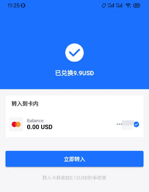 在上一个步骤中兑换完美元后,可以选择立即将美元转入所选的虚拟卡(此操作会将刚刚兑换成功的所有美元都转入卡中),也可以跳过,手动从路径“Dupay App首页 > 卡 > 充值”进入为当前这张预付卡充值美元的界面(此操作可以手动指定具体要充入多少美元)。