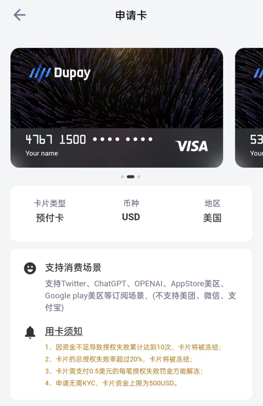 如下图所示,从2023年11月22日起,Dupay推出一款全新的订阅卡,专为订阅各类服务而设计,主打一个低门槛开卡,但有资金上限,以及不支持国内电商平台消费。鉴于Dupay原来的几个卡片开卡和充值成本上升,如果仅仅是为了订阅OpenAI/ChatGPT,也可以考虑开一张此类订阅卡(注意是VISA卡,可别开错了),且Dupay订阅卡无需KYC,也适合对隐私要求比较高的用户。