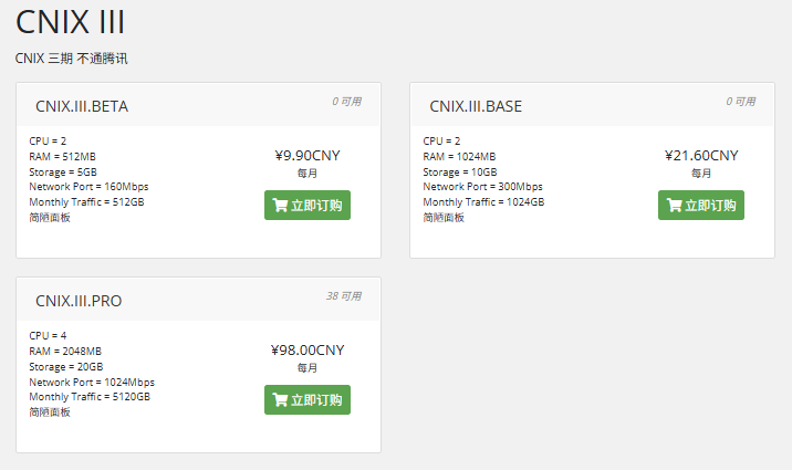 - CNIX三期(YT云途线路,不通腾讯!!!):一二期缺货很久后,2025年底上线的第三期新品,从9.9元/515GB/月,到21.6元/1TB/月,再到98元/5TB/月。目前网友反馈,阿里云广东区域\无忧云深圳电信可以作为三期的前置。要买的拼手速啦!