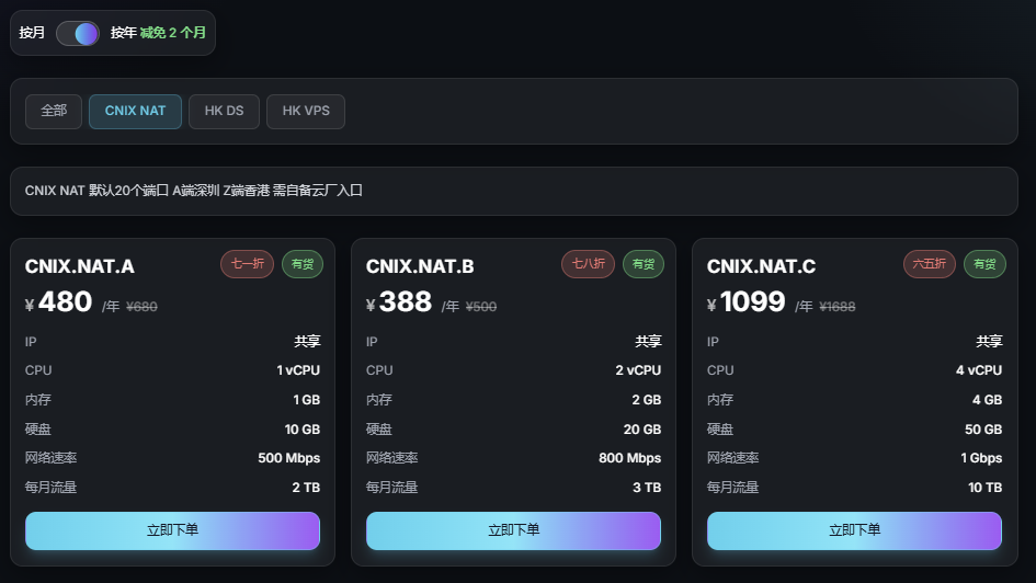 - CNIX二期(香港侧为Jinx出口): 适合大户/合租。例如288元/年,每月2TB双向流量。刚上线时常被抢购一空,也是日常缺货。