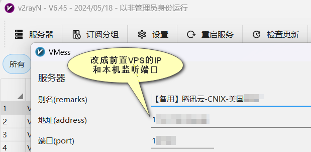 配置完成! 去你的本地电脑的魔法客户端,导入原始(落地机)的魔法节点链接后,手动编辑一下,如下图(改成前置机的IP和监听端口):