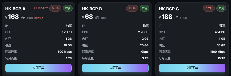 但是,最近YT.NET(云途)搞了个新花样,让我觉得眼前一亮。他们新出的套餐简单粗暴:直接卖你一台香港VPS,然后免费送你CNIX NAT内网入口。具体产品在这里。